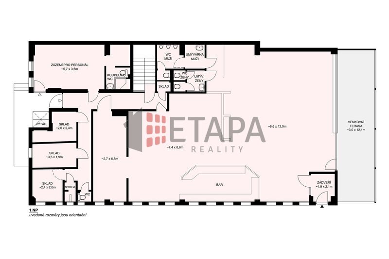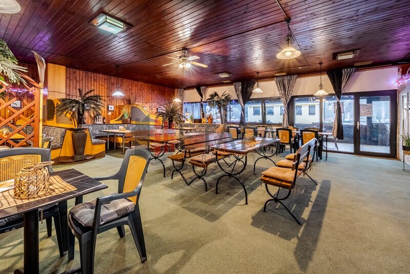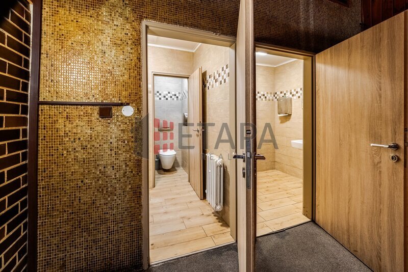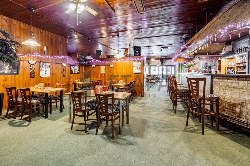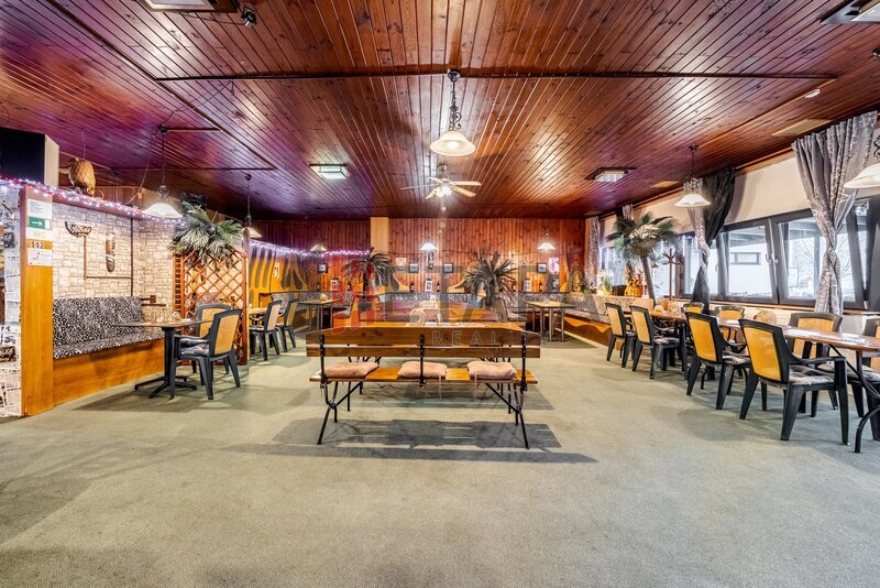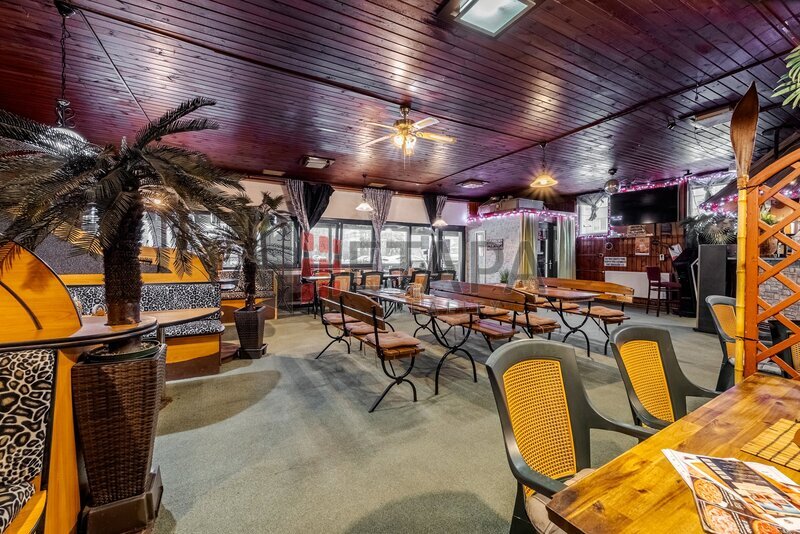 Hlavní provozní část tvoří posezení pro hosty s kapacitou 100 míst, bar, modernizované sociální zařízení po kompletní rekonstrukci v roce 2024, skladové prostory a zázemí pro personál. Celková výměra těchto prostor činí 272 m², terasa má 36 m². Sklepní prostory o velikosti 82 m² zahrnují sklady, kotelnu a zásobovací výtah. Objekt disponuje dvěma samostatnými vstupy a parkování je možné v bezprostředním okolí.