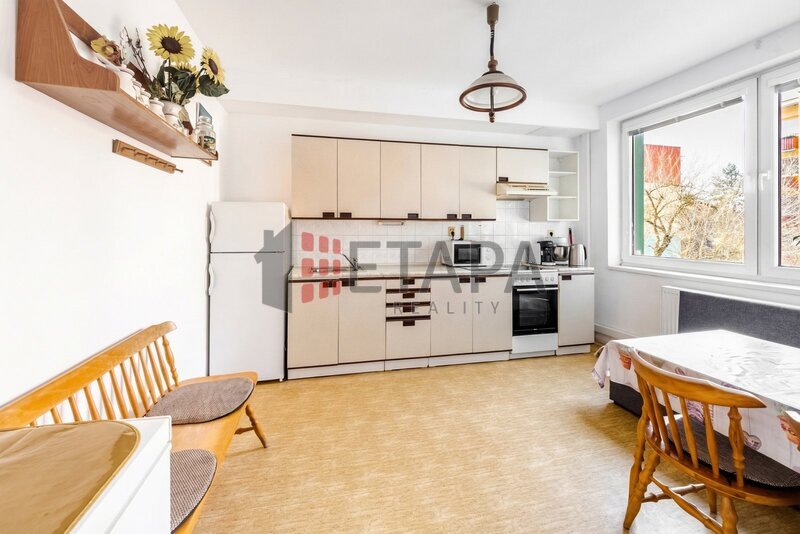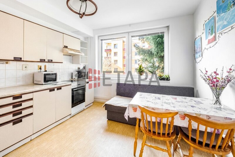 Byt je v původním, ale velmi dobře udržovaném stavu a nabízí praktické dispoziční řešení. Skládá se ze dvou pokojů, kuchyně se starší kuchyňskou linkou a dostatkem místa pro jídelní stůl, zděné koupelny s vanou a umyvadlem a samostatné toalety. K bytu náleží sklepní kóje. Měsíční náklady na bydlení jsou standardní. Parkování je možné přímo u domu.