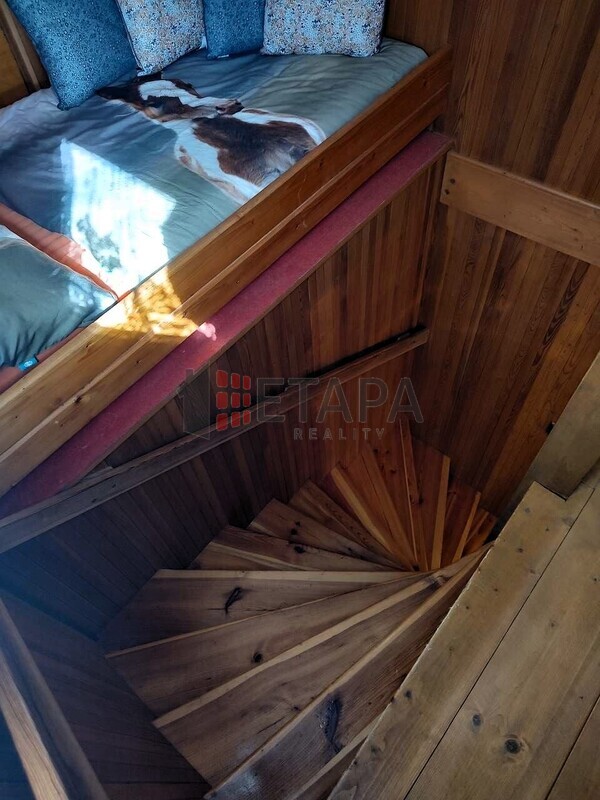 Chata je z větší části podsklepená, přičemž sklepní prostory lze využít jako sklad nebo příjemné posezení. V prvním nadzemním podlaží se nachází venkovní terasa s krásným výhledem na Malši, chodba, menší kompletně vybavená kuchyně a světlý obývací pokoj s krbovými kamny a šamotovým komínem. Dále prostorná koupelna se sprchovým koutem, umyvadlem a toaletou. V obytném podkroví jsou dvě útulné ložnice, přístupné po dřevěném schodišti. V chatě nechybí praktické úložné prostory, podlahy tvoří dlažba, linoleum a koberce. Okna v přízemí jsou dřevěná eurookna, v podkroví zachovalá dřevěná.